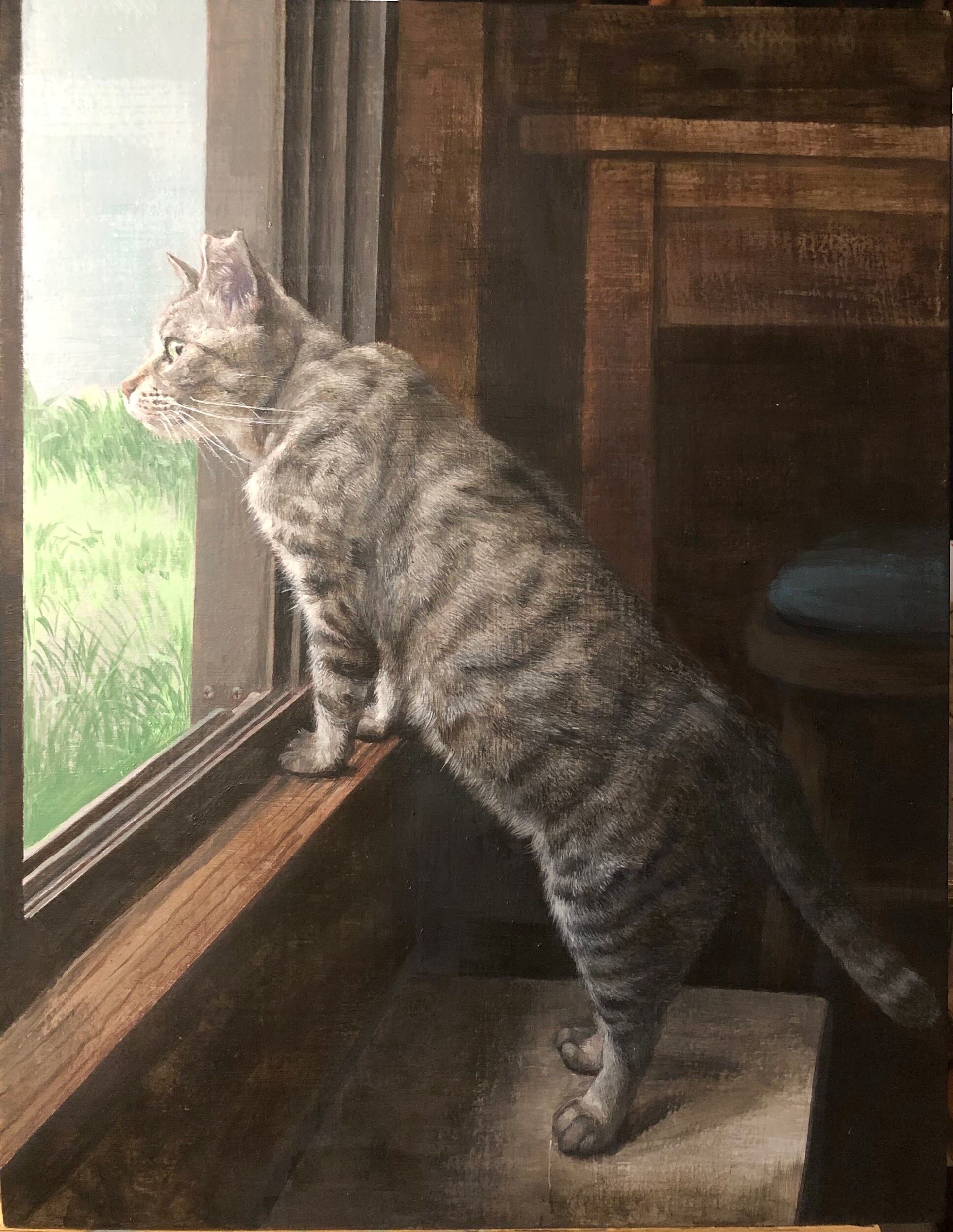 窓から外を見つめる猫をモチーフに光の明暗を意識して描いています。